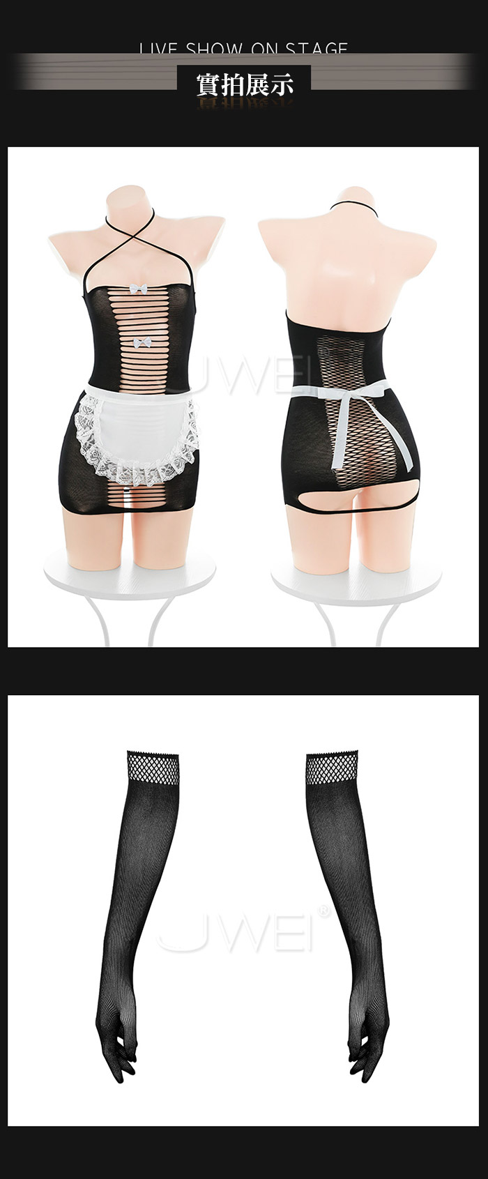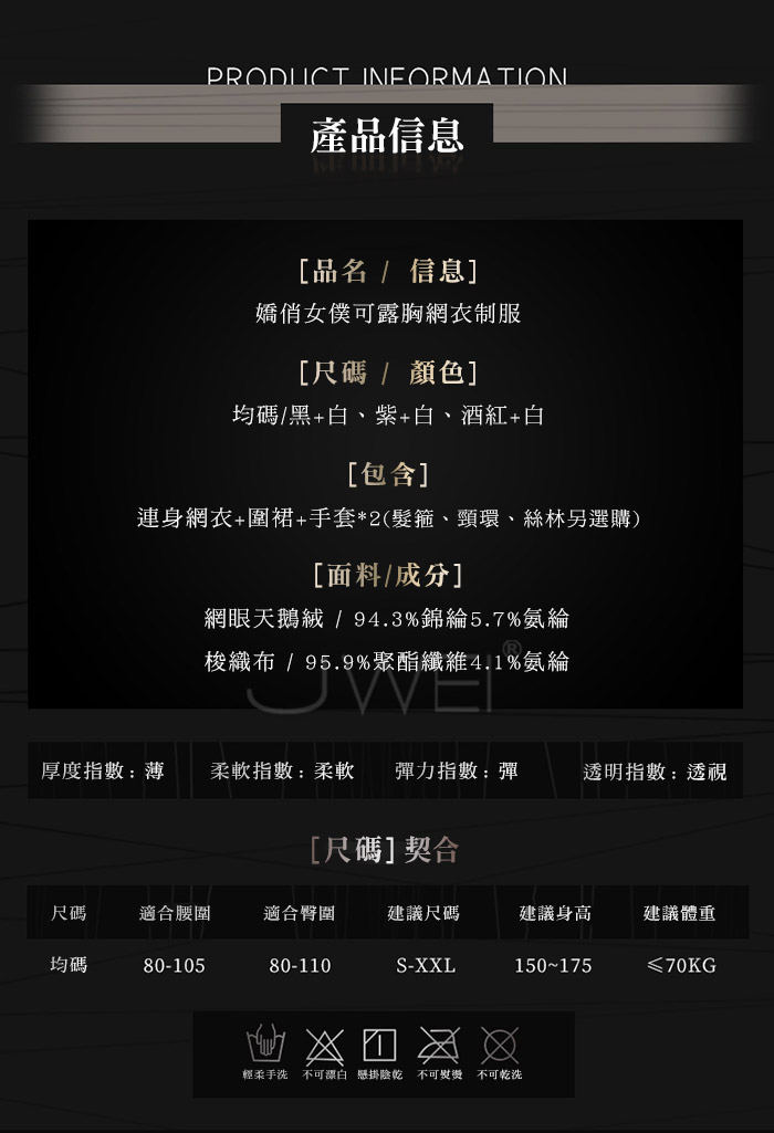 ■內容物:連身網衣+圍裙+手套*2 ■適穿尺寸:FREESIZE ■彈性:彈 ■未撐開平量尺寸正負誤差1~2cm,1吋=2.54cm ■注意事項:基於保障消費者個人衛生,此貼身衣物恕不接受退換貨。 (如為商品本身暇疵,接受七日內換貨,請勿試穿,謝謝您)