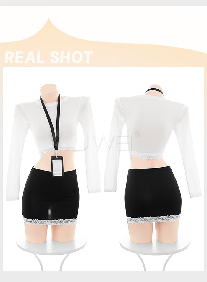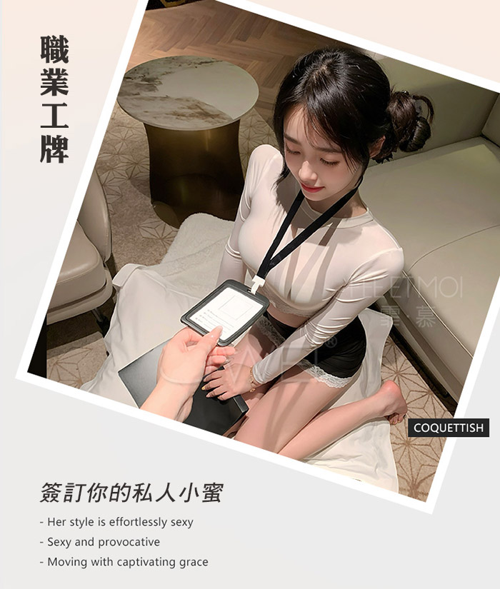 | 職場佳麗.撩撥暗慾腰腹雙邊蕾絲秘書套裝【上衣+工牌+包臀裙】
