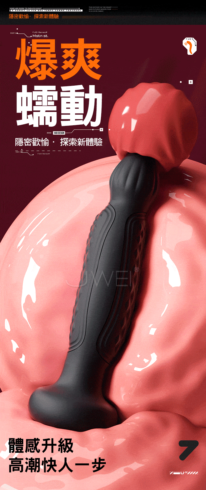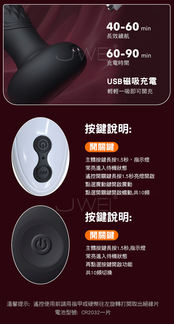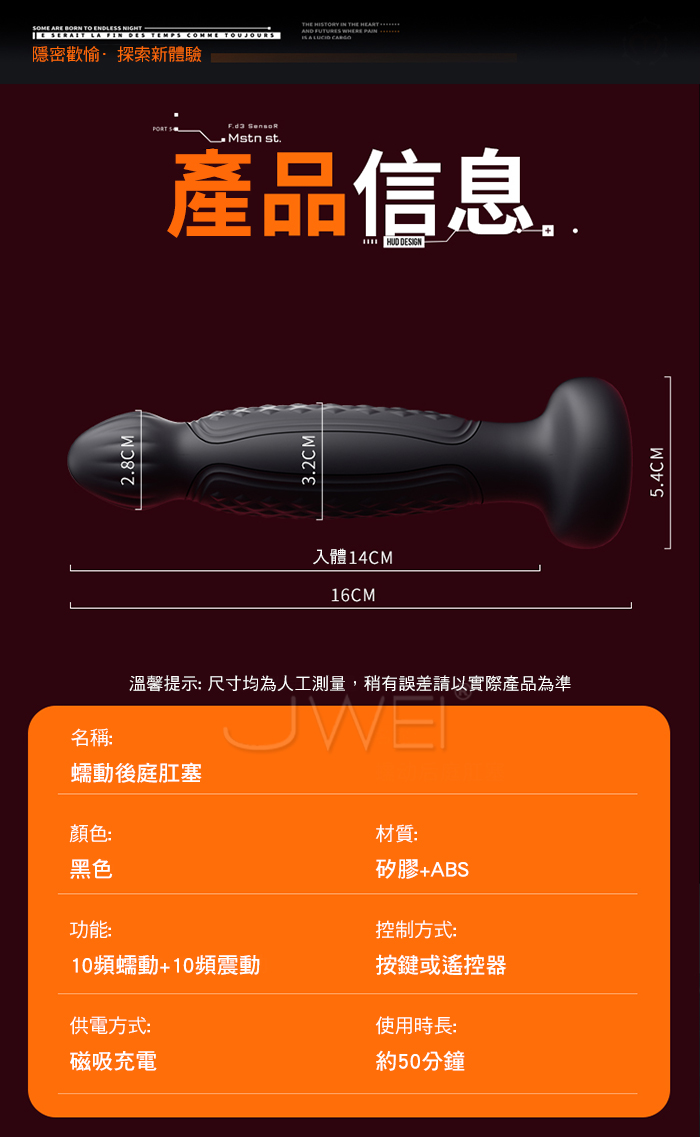 爆爽蠕動,隱密歡愉 探索新體驗,體感升級 高潮快人一步! 10頻蠕震,頻率滿足,波浪式推進,節律收縮 一波接一波的深入 強勁馬達,從啟動到變速毫無頓挫感,告别卡頓 產品規格 ■材質: 矽膠+ABS ■規格: 詳如圖片標示 ■功能: 10頻蠕動、10頻震動、遙控