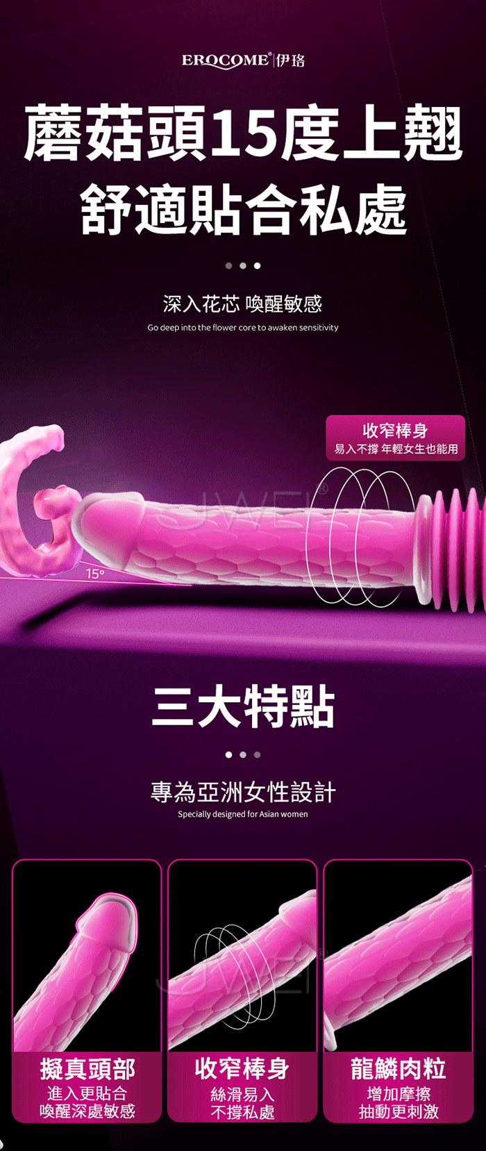 1.仿真頭部,龍鱗紋理 2.3頻伸縮,自動抽送 3.尺寸適中,不撐大私處 4.智能加溫,拒絕冰冷 5.雙層矽膠,放心安全 6.全身防水,玩法多樣 7.搭配吸盤,解放雙手 8.遠程遙控,玩法多樣 產品規格 ■尺寸:大小詳如圖片標示 ■材質:TPE+ABS ■功能:3頻伸縮、10頻震動、、無線遙控、吸盤底座、加溫
