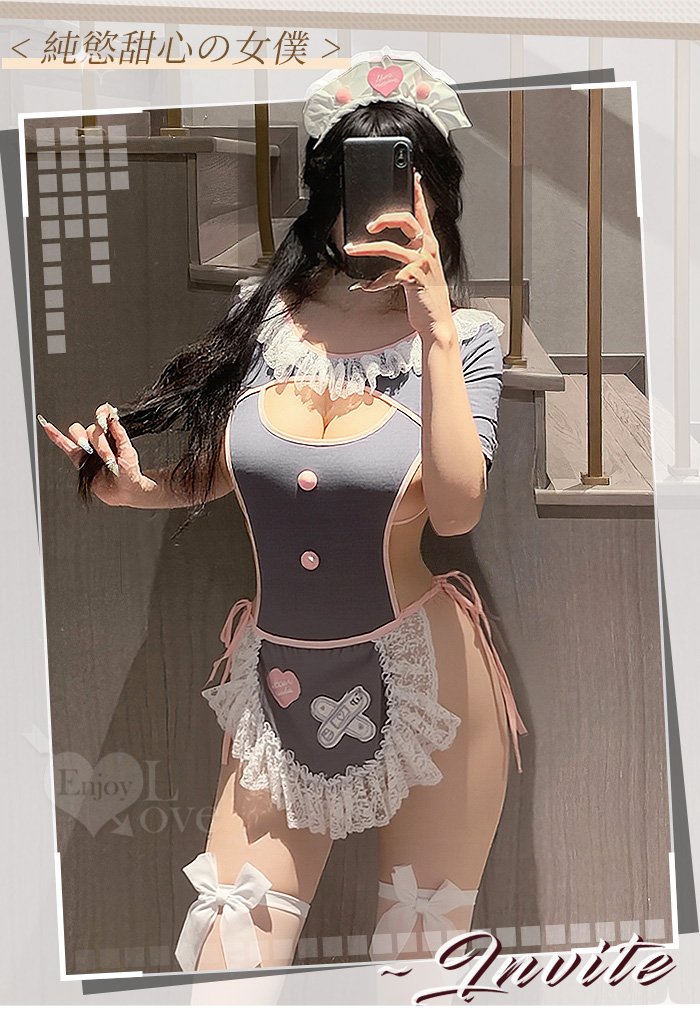 女僕角色扮演服|滾邊蕾絲・兩側挖空・翹臀剪裁開襠連身衣三件組
