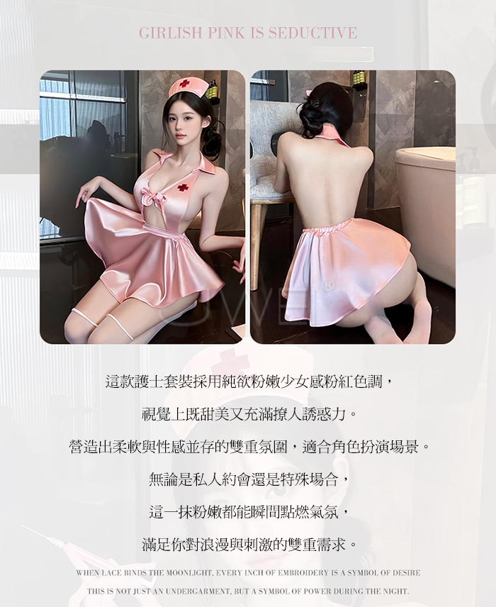 ►您現在的位置:首頁>蜜糖護誘.粉嫩甜美深V露溝高腰短百褶裙擺護士裝【髮箍+洋裝+T褲】