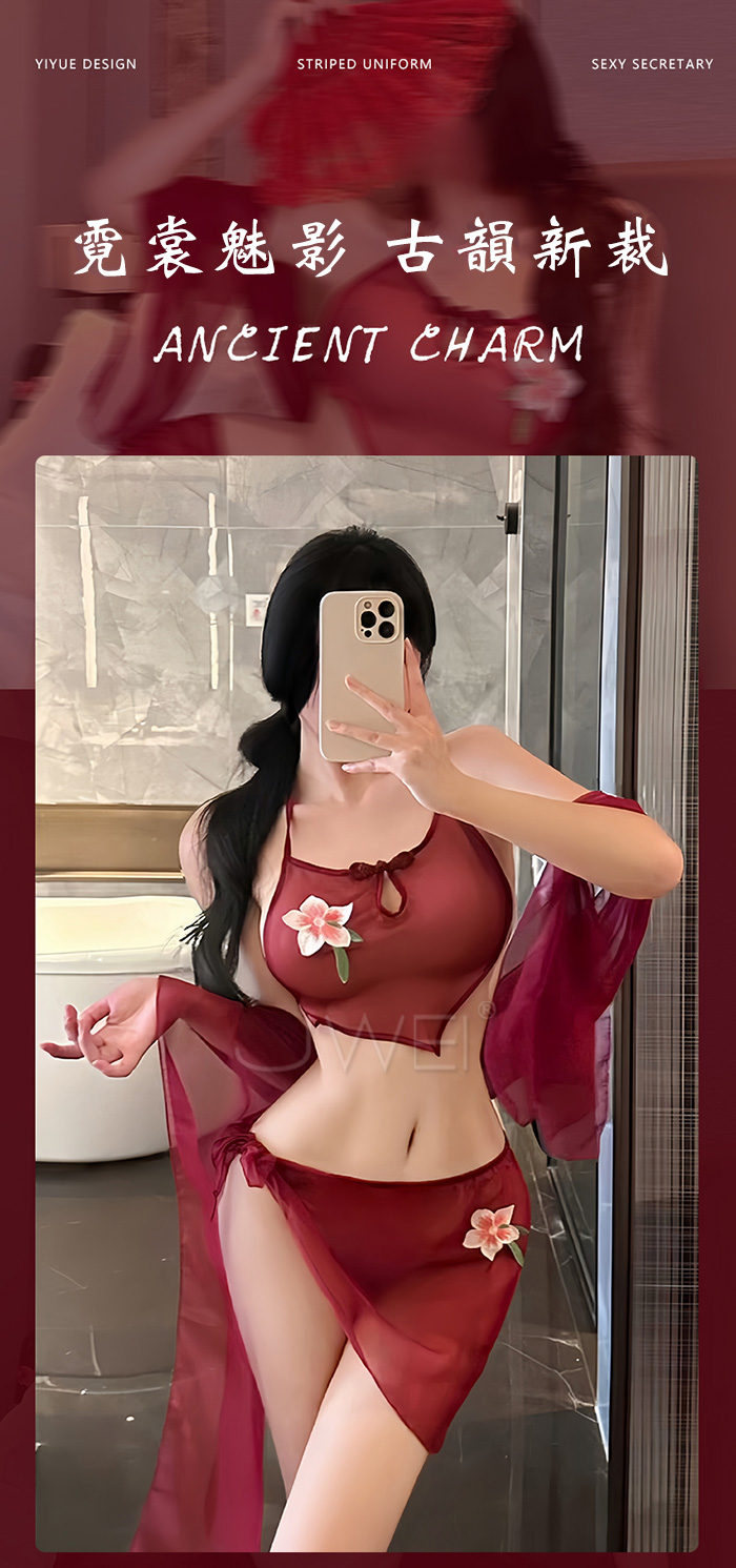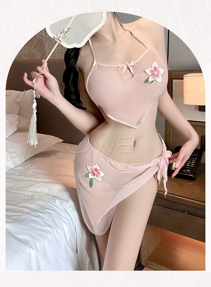| 霓裳魅影.薄紗透視美背繫帶古風舞姬肚兜套裝【肚兜+短裙+披肩-粉色】