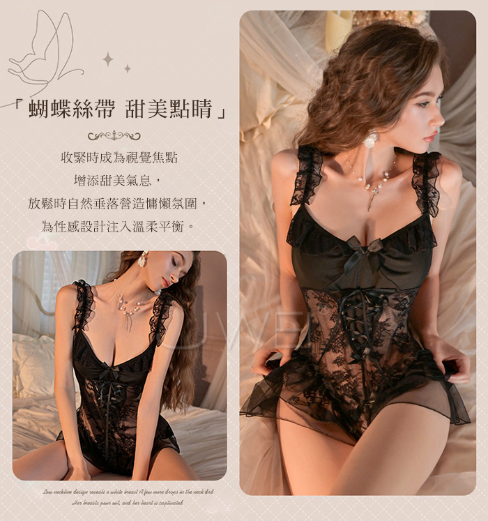 | 慾情薔薇.蕾絲深V美肩露背花蔓透紗開襠連體衣【黑色】